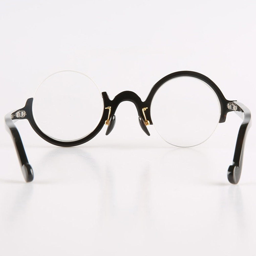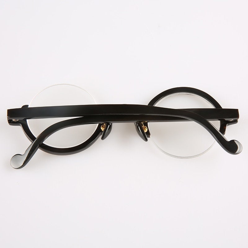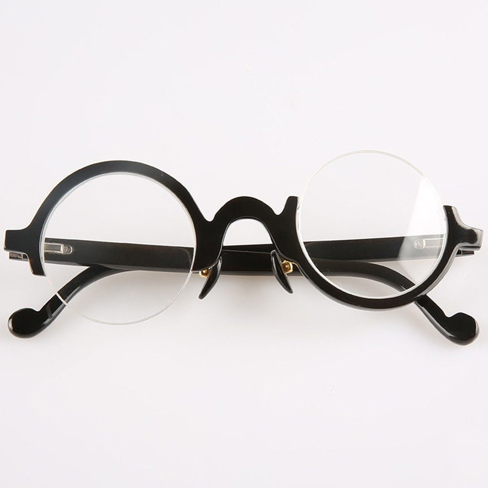Dive into avant-garde style with these half-rim eyeglasses. Crafted from genuine buffalo horn, they feature petite round lenses. Their asymmetrical design stands out with one side resembling a classic half rim, while the other intriguingly inverts this look, offering an upside-down appeal. These glasses aren't just eyewear; they're a conversation piece for those bold enough to defy the ordinary.